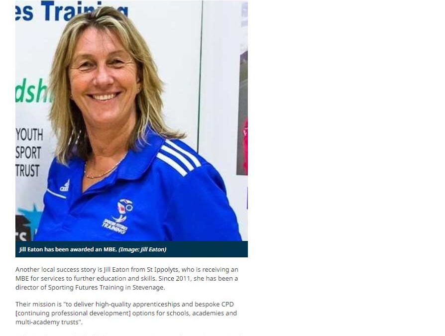 Celebrating an MBE, awarded for her services to further education and skills in June 2023 is Jill Eaton, Director, Sporting Futures Training. Since 2011 Jill has worked alongside fellow Director, Jo Poutney, their mission is ‘to deliver high-quality’ apprenticeships and bespoke CPD (continuing professional development) options for schools, academies and multi-academy trusts’.